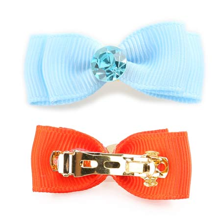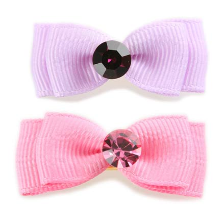Заколочка выполнена в виде двойного бантика и украшена переливающимся стразом.