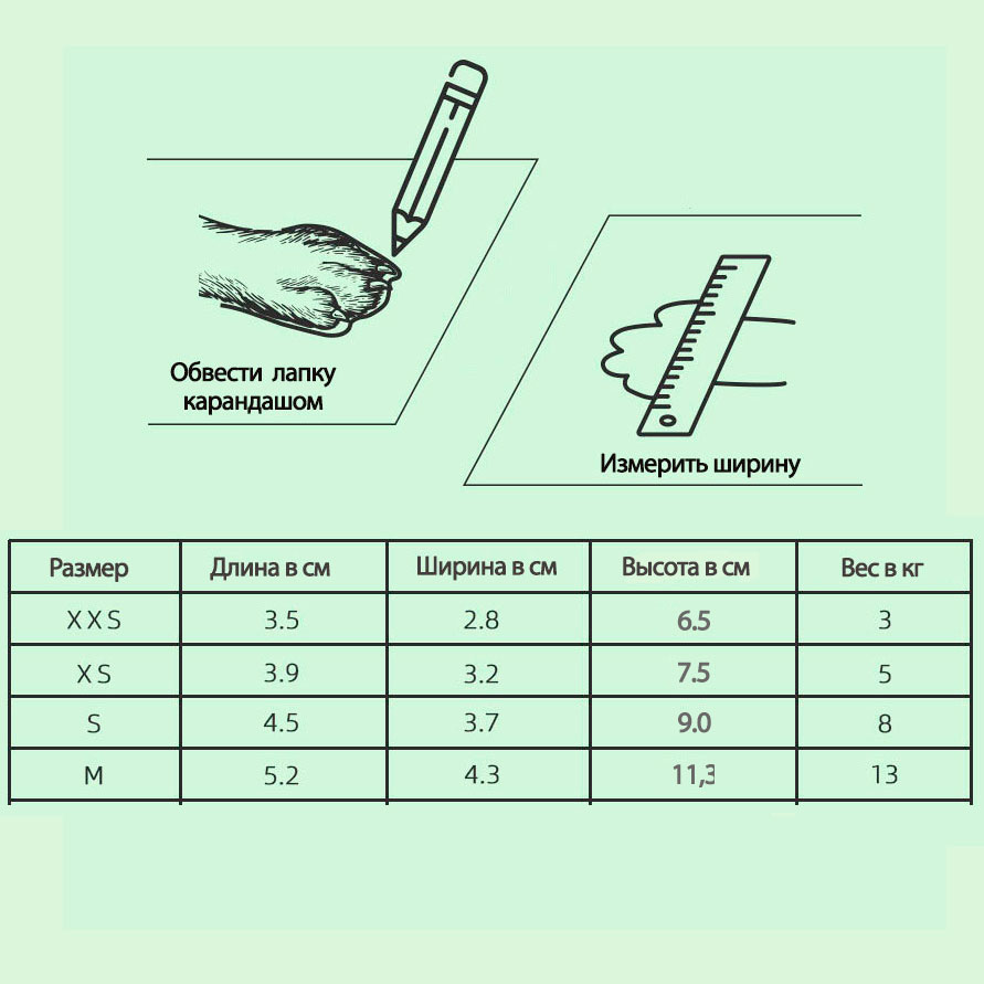 Чтобы выбрать идеальный размер, поставьте питомца на лист бумаги, обведите лапу и измерьте длину и ширину.