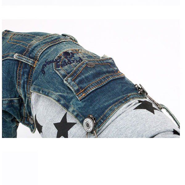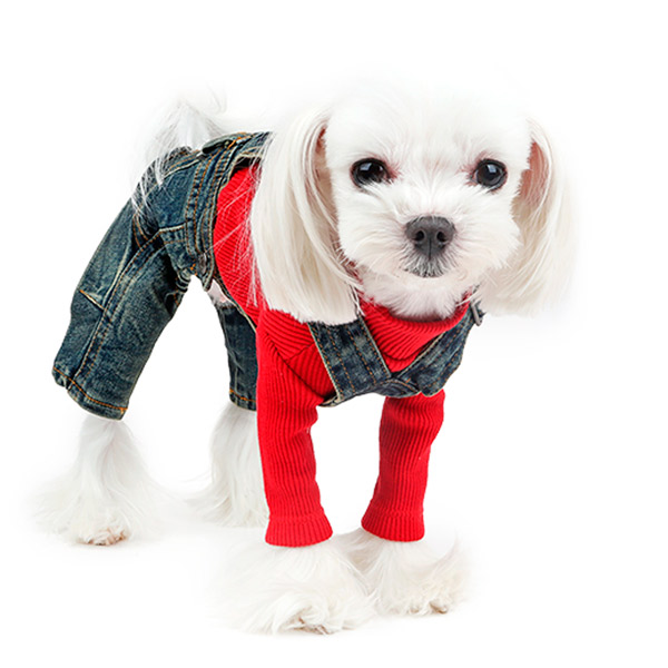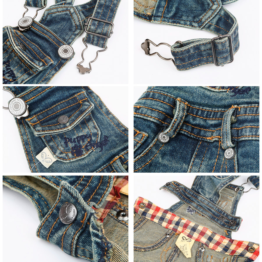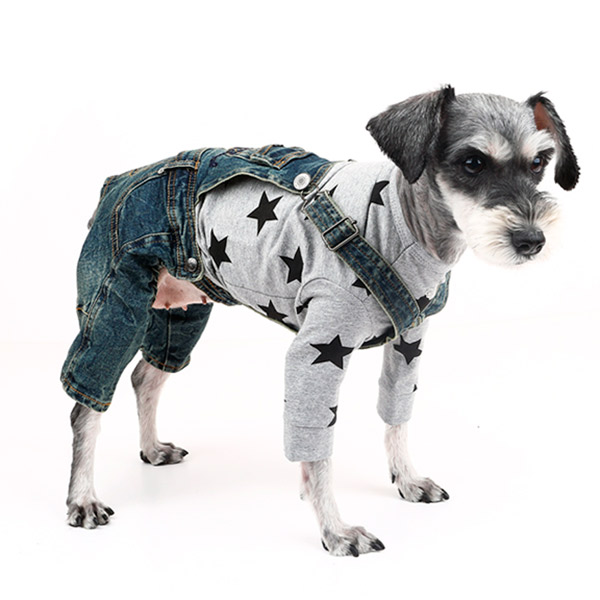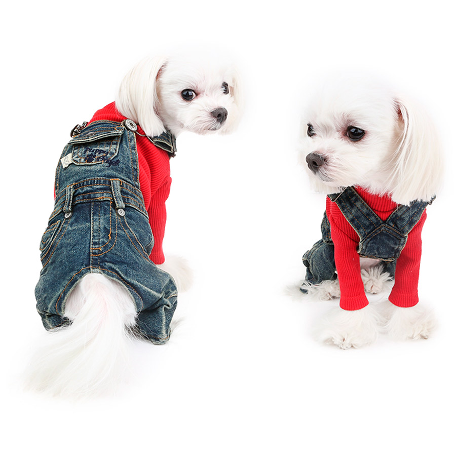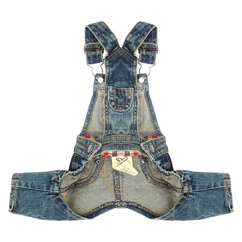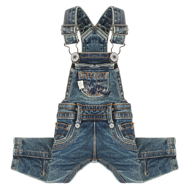 Классический джинсовый комбинезон для собак. Выполнен как настоящие человеческие джинсы, с эффектом потертости. Декоративная двойная строчка, клепки на карманах, шлевки для ремня. Застежка на кнопку. Идеально подходят для собачек с длинными ногами.