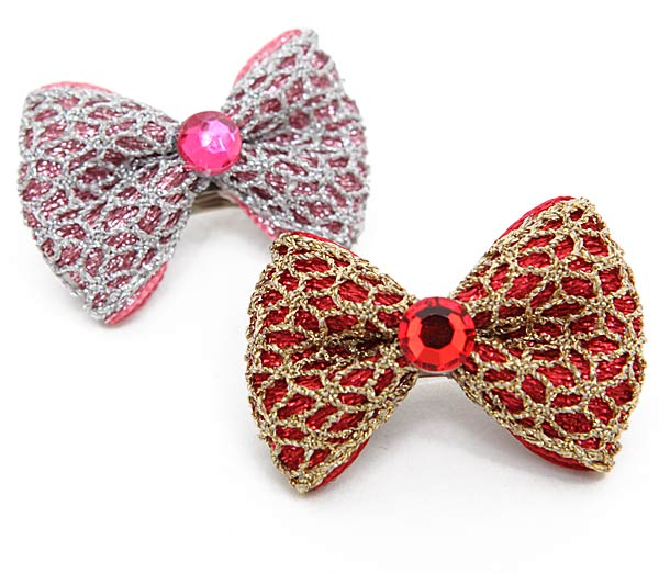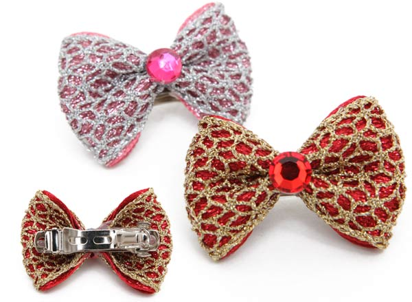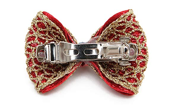 Заколочка представлена в двух цветовых вариантах: красный бант с золотистой сеточкой и нежно-розовый бант с серебристой сеточкой.