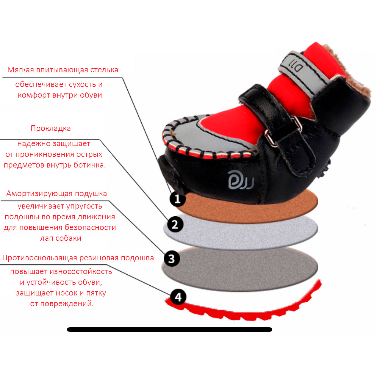 - противоскользящая резиновая подошва повышает износостойкость и устойчивость обуви, защищает носок и пятку от повреждений. - Эластичная верхняя часть ботинка: дает возможность суставам пальцев ног собаки перемещаться свободно и без ограничений.