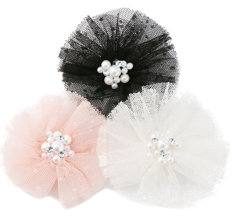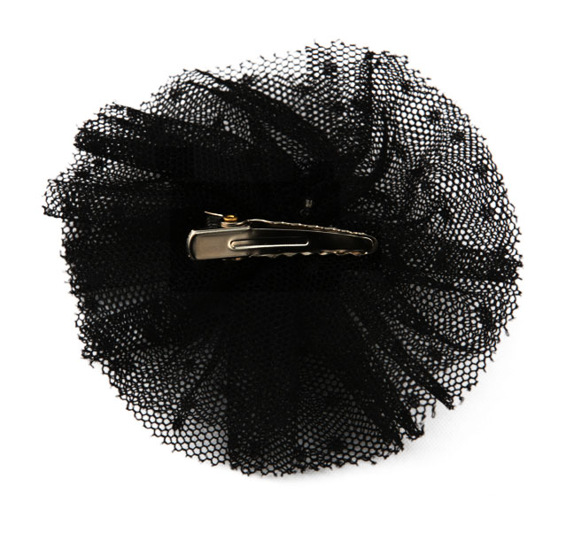 Заколочка выполнена просто, но со вкусом. Она изготовлена из сетки и представляет собой пышный бант, который в центре украшен жемчужными бусинами и стразами.
