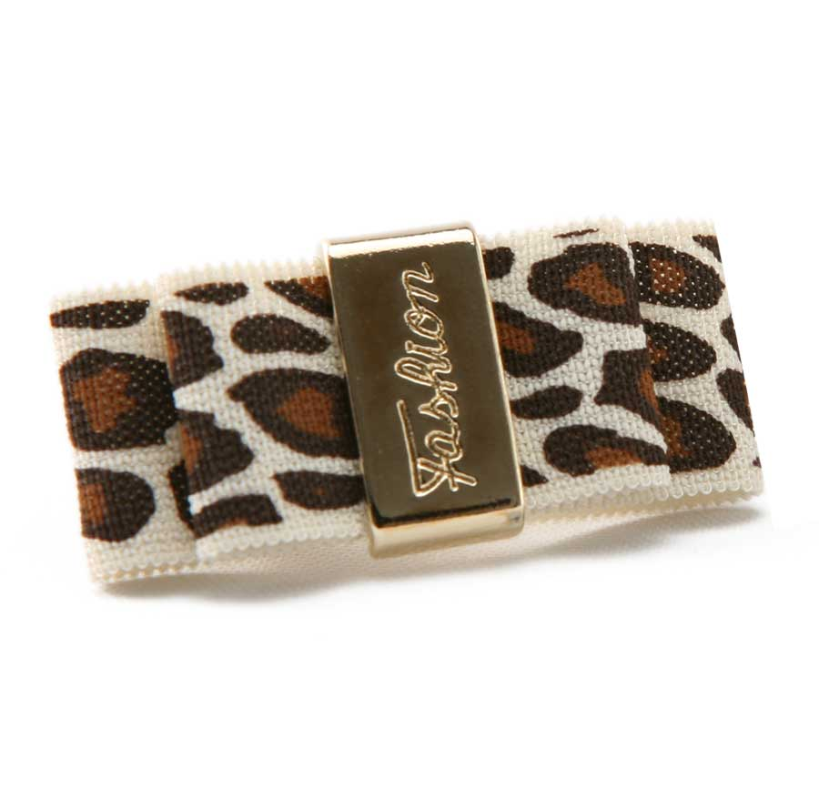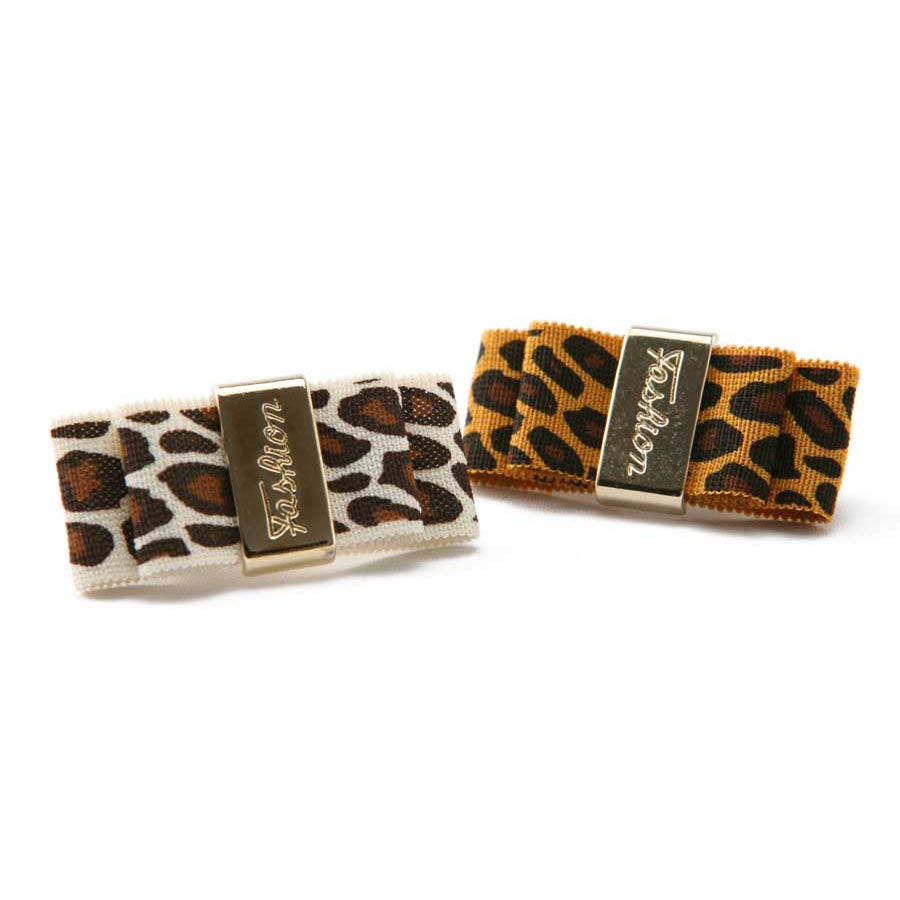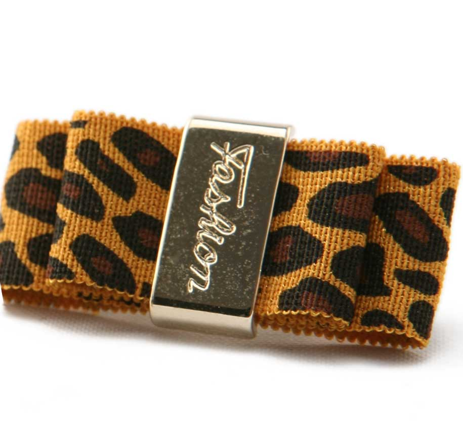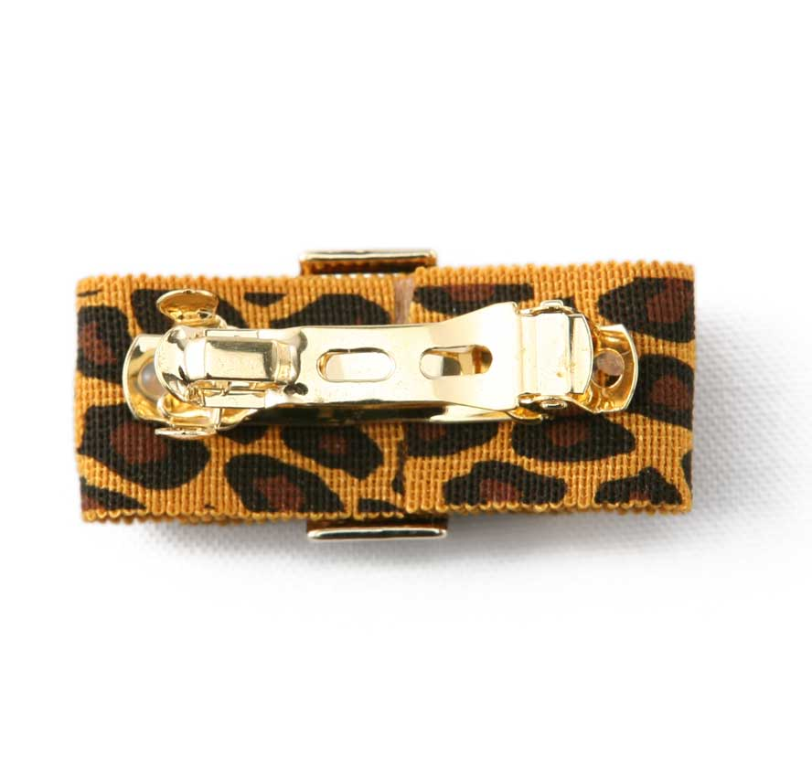 Заколка в форме бантика изготовлена из ткани с леопардовым принтом.