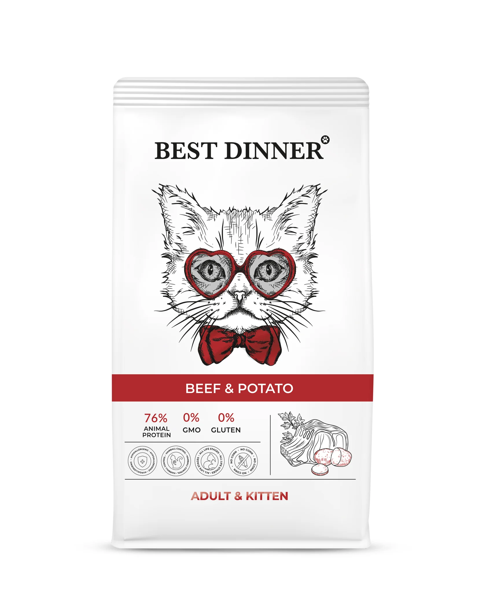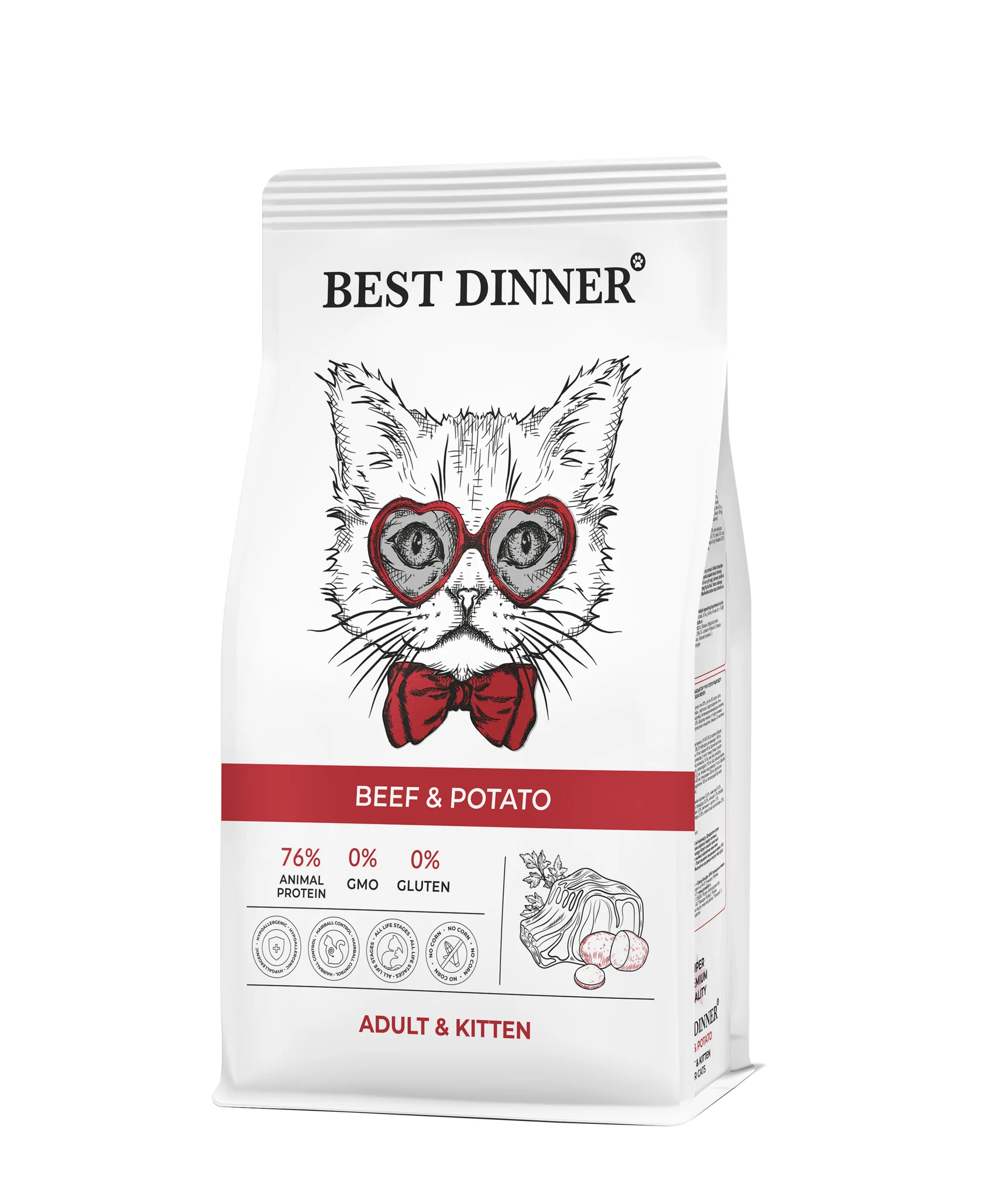 Высококачественный полнорационный корм для кошек Best Dinner с говядиной и картофелем, создан с учетом физиологических потребностей кошек и котят. Вкусная говядина богата необходимыми аминокислотами для здоровья питомца и правильного роста котят. Клюква и DL - метионин, добавленные в рецептуру профилактируют мочекаменную болезнь, а Юкка Шидигера прекрасно подойдет для вывода шерсти и устранения неприятных запахов из лотка. Гранулы в форме сердечек не оставят равнодушными даже самых привередливых кошек.