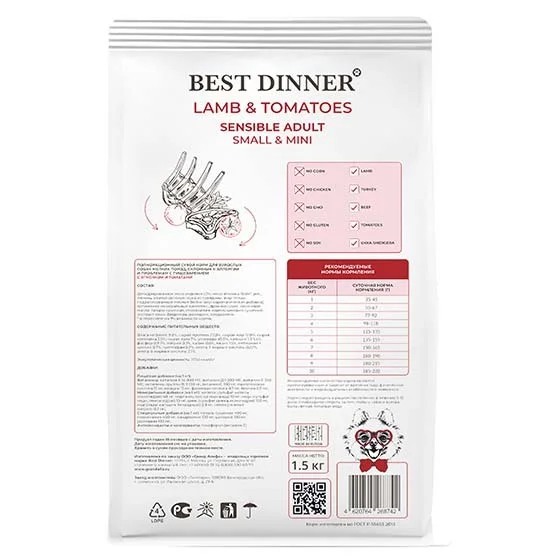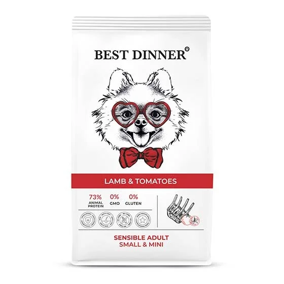 Высококачественный полнорационный корм для собак мелких пород Best Dinner с ягненком и томатами создан специально для собак с особыми потребностями. Томаты - источник холина и каротиноидов. Способствуют профилактике болезней сердца и укрепляют иммунитет. Нежное мясо ягненка обладает отличной усвояемостью и подходит для собак склонных к аллергическим реакциям и проблемами с пищеварением.