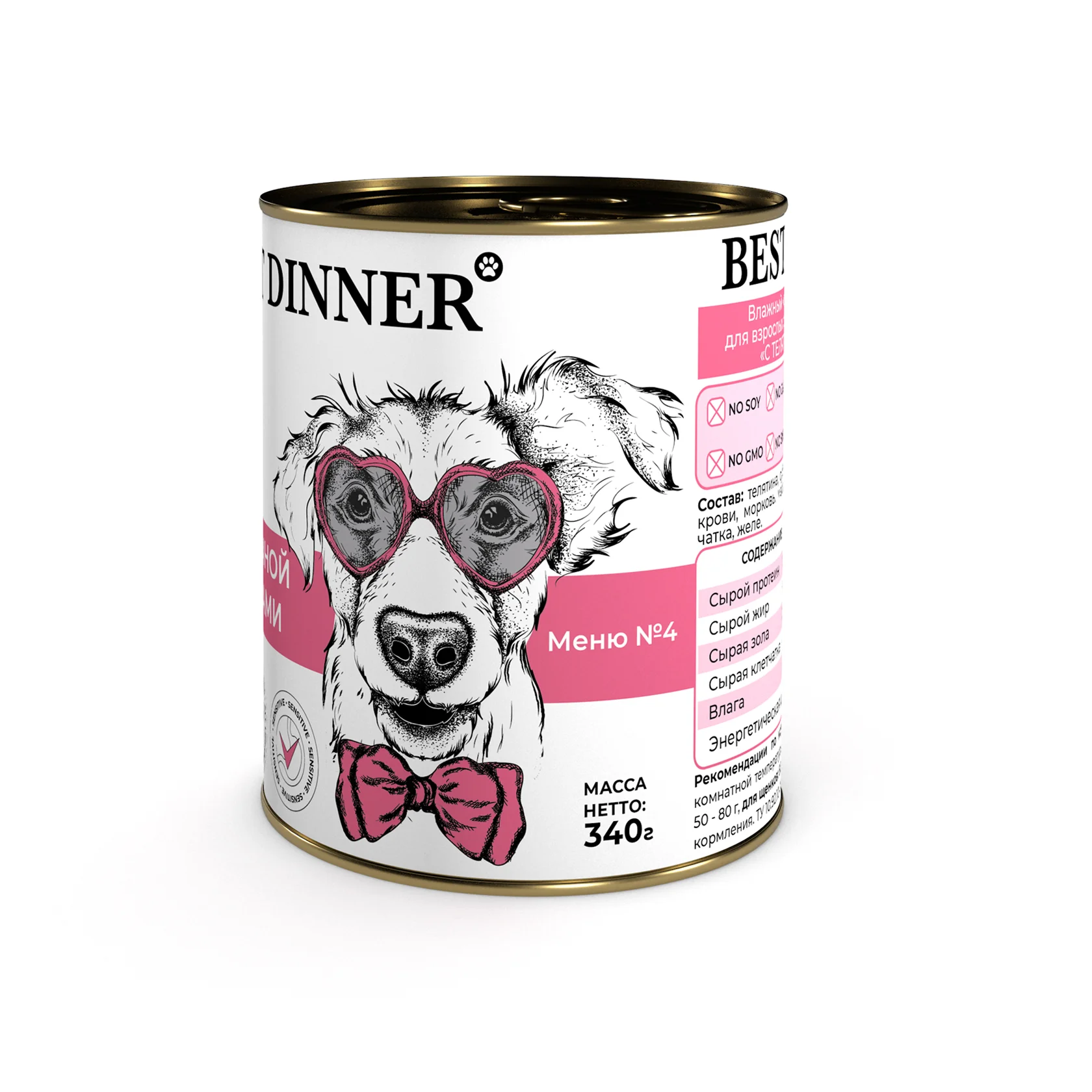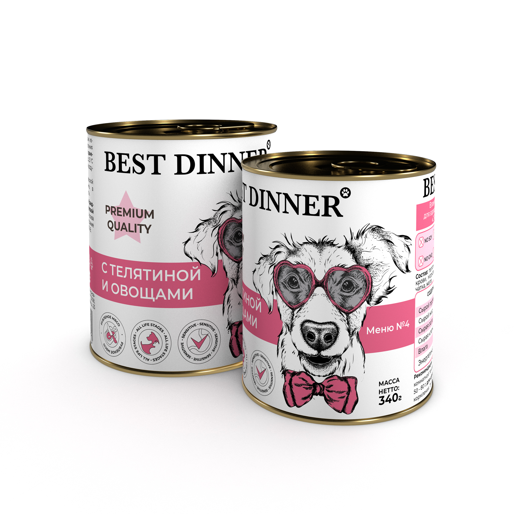 Сбалансированный корм премиум-класса Best Dinner с телятиной и овощами полностью удовлетворяет потребность собаки в белках, макро- и микроэлементах Телятина – нежирное мясо, оно полностью усваивается и не вызывает аллергии, обеспечивает собаке необходимую энергию на весь день. Морковь и лук, как источник клетчатки в готовом рационе, нормализуют пищеварение, стимулируя перистальтику кишечника, насыщают организм животного микроэлементами. Рыбий жир является источником энергии и Омега-3 жирных кислот. Оптимальное содержание влаги облегчает щенкам поедание корма, помогает организму лучше усваивать витамины и минералы. Приятный мясной запах консервированного корма привлекает собак и вызывает у них аппетит.
