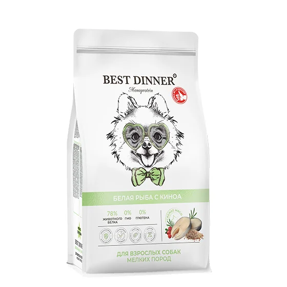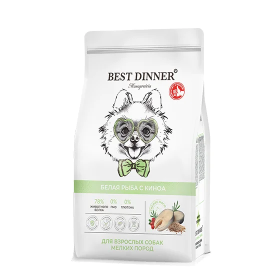 Best Dinner Монопротеин Белая рыба и Киноа это оптимальное решение для взрослых собак мелких пород, страдающих аллергией и проблемами с пищеварением. Данный рацион изготовлен исключительно из сельдевых пород рыб и европейского анчоуса - источники высококачественного белка и Омега-3 жирных кислот, необходимых для здоровья кожи и шерсти. Киноа, богата клетчаткой способствует нормализации работы кишечника и улучшению усвоения питательных веществ. Корм обогащен витаминами и минералами, поддерживающими иммунитет, здоровье костей и суставов. Идеально сбалансированная формула обеспечивает собаке энергию и жизненную силу, не перегружая пищеварительную систему.