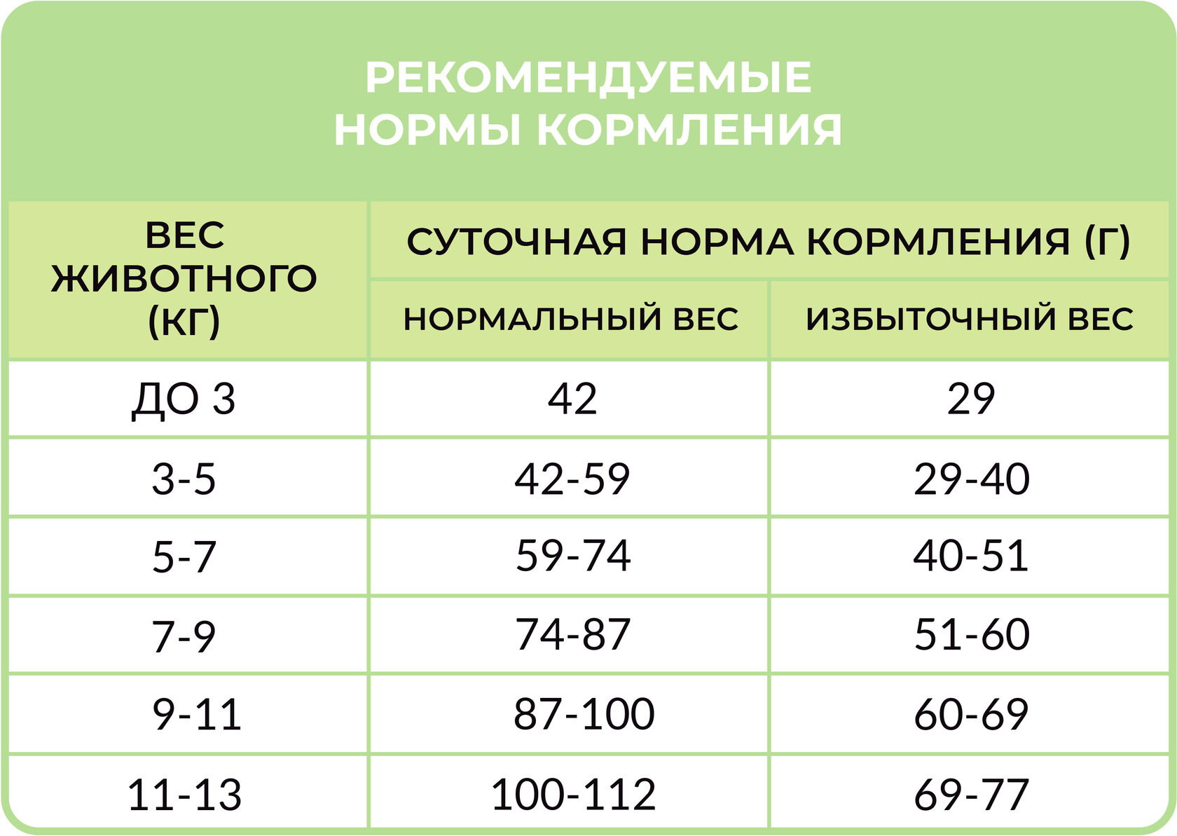 Рекомендуемое количество корма является ориентировочным и зависит от времени года, физической активности и индивидуальных особенностей животного.