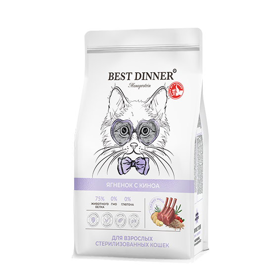 Best Dinner Монопротеин Ягненок с Киноа разработан специально для стерилизованных и кастрированных кошек, страдающих от аллергии и проблем с пищеварением. Основу рациона составляет легкоусвояемое мясо ягненка - оптимальный источник белка для кошек с чувствительным пищеварением. Киноа - это ценный источник клетчатки, витаминов и минералов, который способствует нормализации пищеварения и поддержанию здоровой микрофлоры кишечника. Киноа помогает кошкам усваивать все необходимые питательные вещества, избегая дискомфорта и расстройств.