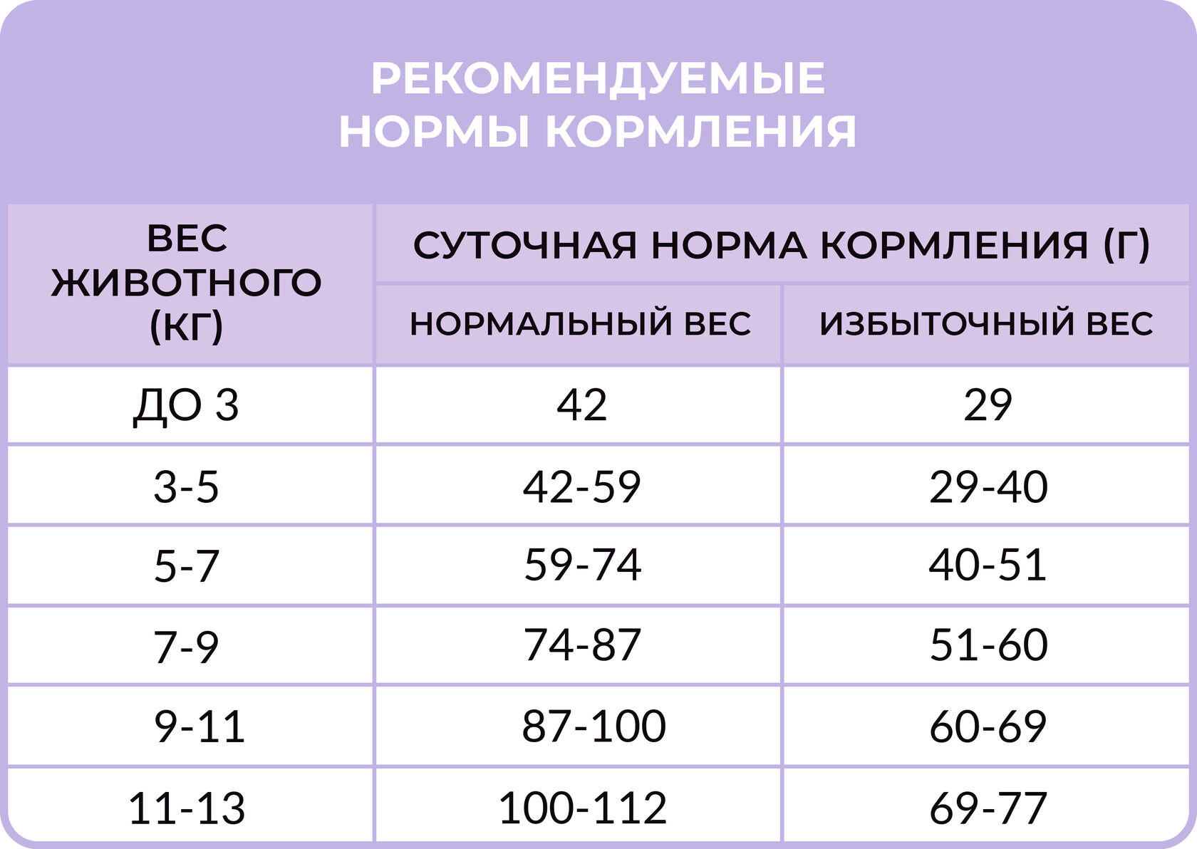 Рекомендуемое количество корма является ориентировочным и зависит от времени года, физической активности и индивидуальных особенностей животного.