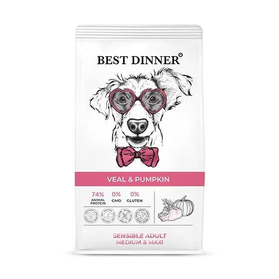 Высококачественный полнорационный корм для собак средних и крупных пород Best Dinner с телятиной и тыквой создан специально для собак с особыми потребностями. Вкусная телятина с добавлением индейки понравится даже самым привередливым питомцам. Корень цикория способствует росту полезной кишечной микрофлоры и улучшению усвояемости корма. Тыква, это отличный источник всех необходимых витаминов и клетчатки, который отлично подходит для животных с чувствительным пищеварением.