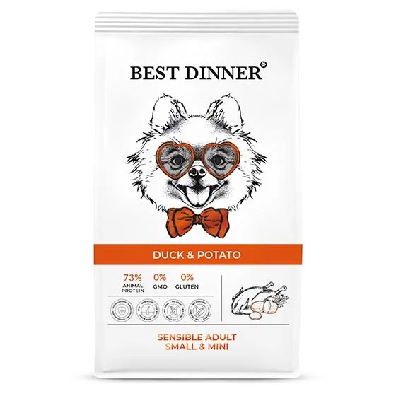 Высококачественный полнорационный корм для собак мелких пород Best Dinner с с уткой и картофелем создан специально для собак с особыми потребностями. Нежное мясо утки обладает отличной усвояемостью и подходит для собак склонных к аллергическим реакциям и проблемами с пищеварением. Юкка Шидигера способствует улучшению пищеварения. Экстракт бархатцев поможет в снятии воспалений с чувствительной пищеварительной системы.