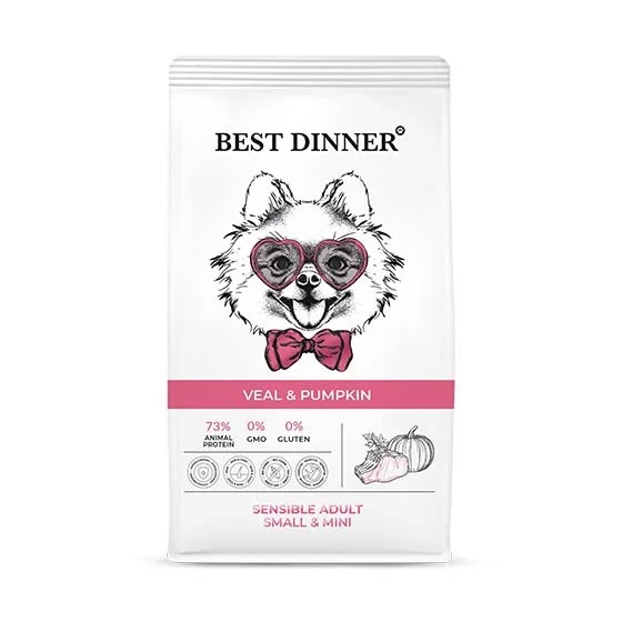 Высококачественный полнорационный корм для собак мелких пород Best Dinner с телятиной и тыквой создан специально для собак с особыми потребностями. Вкусная телятина с добавлением индейки понравится даже самым привередливым питомцам. Корень цикория способствует росту полезной кишечной микрофлоры и улучшению усвояемости корма. Тыква, это отличный источник всех необходимых витаминов и клетчатки, который отлично подходит для животных с чувствительным пищеварением.