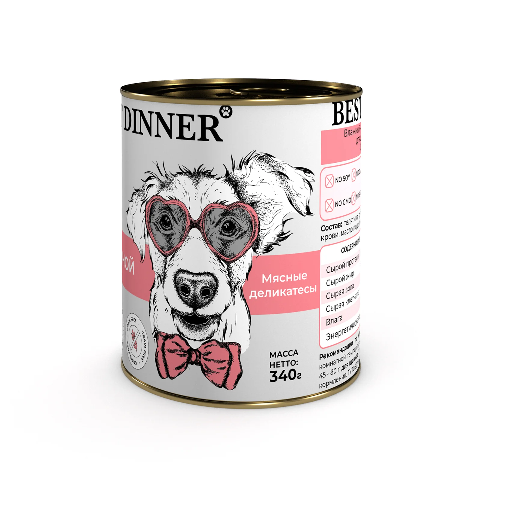Мясное ассорти, изготовленное из натурального мяса, без использования искусственных добавок. Среди всех видов мяса, ценных для собаки, телятина может занимать первое место: она богата протеинами, многочисленными витаминами и аминокислотами, в ней практически нет жира. Именно поэтому ее рекомендуют для кормления щенков и беременных, кормящих животных. Собаки любят телятину за нежные и мягкие волокна, тонкий мясной аромат и приятное чувство насыщения без ощущения тяжести в желудке и кишечнике. Такой животный белок полностью усваивается, способствует восстановлению мышечной ткани, поддерживает здоровье и иммунитет питомца. В этом корме содержится достаточно влаги, необходимой для правильного функционирования выделительной системы. Мясной деликатес также может быть диетическим кормом, лакомством или поощрением для любимца.