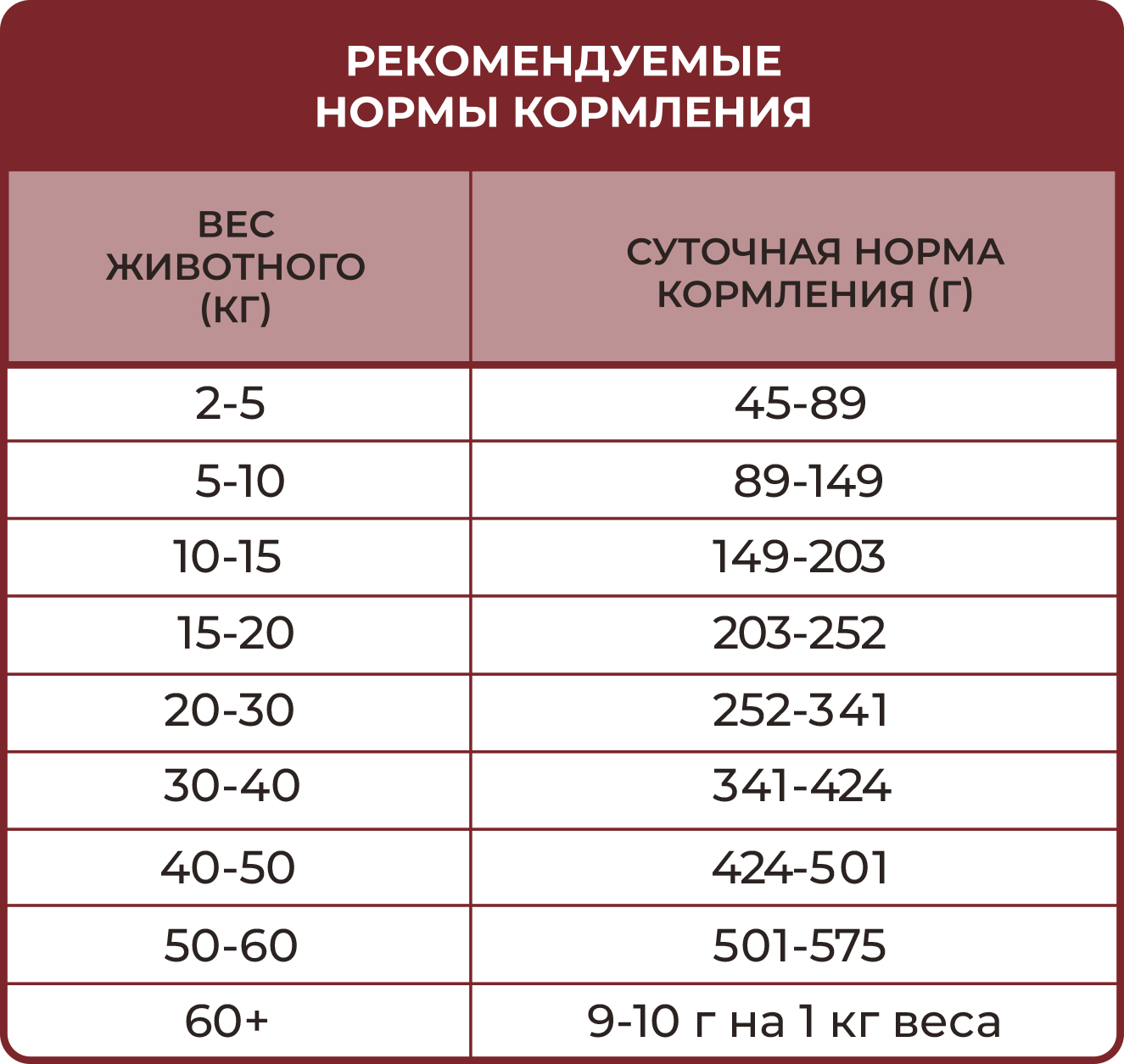 Рекомендуемое количество корма является ориентировочным и зависит от времени года, физической активности и индивидуальных особенностей животного.
