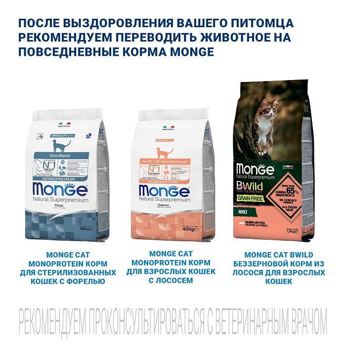 Диета Monge VetSolution Dermatosis — полнорационный сухой диетический корм из лосося для кошек «DERMATOSIS» для восстановления функций кожи при дерматологических заболеваниях и избыточном выпадении шерсти у кошек.