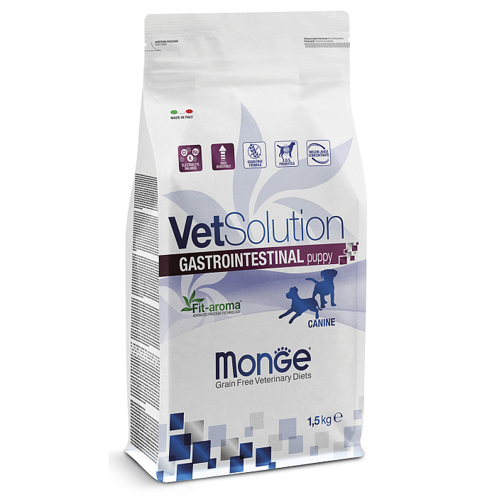 Лечебный корм Monge VetSolution Dog Gastrointestinal для собак Гастроинтестинал при заболеваниях желудочно-кишечного тракта, таких как острый и хронический гастрит, расстройства моторики желудка энтерит и воспалительные заболевания кишечника, энтеропатии с потерей белка, синдром короткой кишки и избыточный бактериальный рост в тонком отделе кишечника, колит, а так же при остром и хроническом панкреатите (для собак, НЕ страдающих ожирением и гипертриглицеридемией).