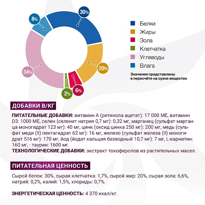 Питательные добавки: витамин А (ретинола ацетат): 17 000 МЕ, витамин D3: 1000 МЕ, селен (селенит натрия 0,36 мг): 0,17 мг, марганец (сульфат марганца моногидрат 105 мг): 34 мг, медь (сульфат меди (II) пентагидрат 53 мг): 13.5 мг, железо (сульфат железа (II) моногидрат 343 мг): 112,8 мг, йод (йодат кальция безводный 10 мг): 6.5 мг, L-карнитин: 160 мг, - таурин: 1600 мг.