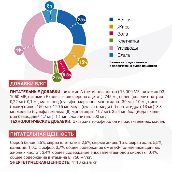сырой белок 25%, сырая клетчатка 2,5%, сырые жиры 15%, сырая зола 5,5%, кальций 1,0%, фосфор 0,7%, общее содержание жирных омега-3 кислот 3,4%, общее содержание эйкозапентаеновой кислоты 0,4%, общее содержание витамина E 750 мг/кг.