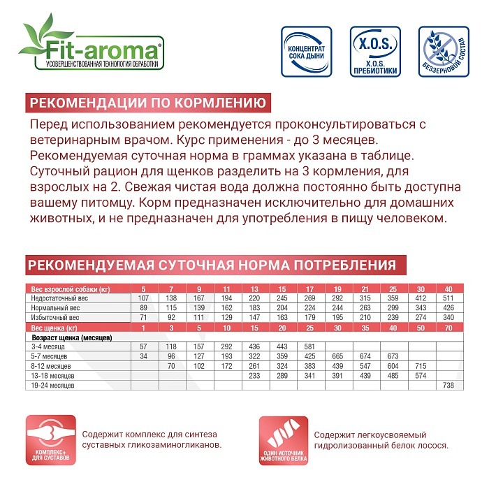 Рекомендуется проконсультироваться с ветеринарным специалистом перед переходом на новый корм и увеличением периода кормления. Рекомендуемый срок кормления при первом употреблении — до 3 месяцев. Рекомендуемый суточный рацион в граммах указан в таблице: разделить на 2 кормления (для взрослых собак) или на 3 кормления (для щенков). Свежая чистая вода должна постоянно быть доступна вашему питомцу.