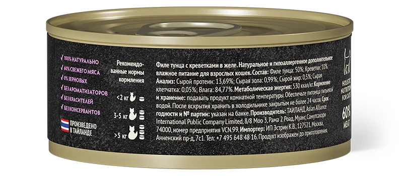 Филе тунца с креветками – источник полезных витаминов и минералов, а также богатый источник белка с высокой степенью переваримости. В креветочном мясе много йода, фосфора, натрия и полезных аминокислот. Поразит даже самого искушенного питомца своим незабываемым вкусом и ароматом.