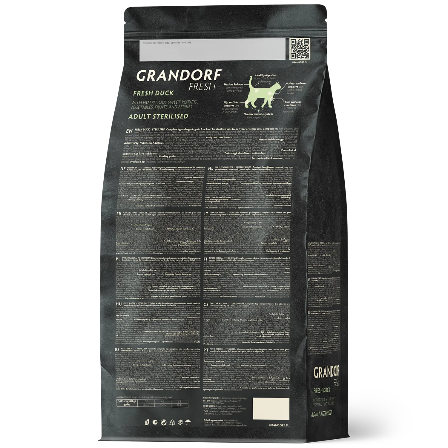 Свежее бескостное мясо утки (26%), Дегидрированное мясо индейки (24%), Батат, Горох, картофель, Порошок корней цикория (натуральный источник пребиотиков: FOS и инулин), Льняное семя, Минералы, Жир индейки (1%), Пивные дрожжи (природный источник MOS и бета-глюканов), Масло лосося (1%), Яблоки, Морковь, Клюква, Черника, Брокколи, Шпинат, Помидоры, Глюкозамина гидрохлорид (100 мг/кг), Хондроитина сульфат (100 мг/кг), юкка Шидигера, Грейпфрут, Розмарин, Куркума.