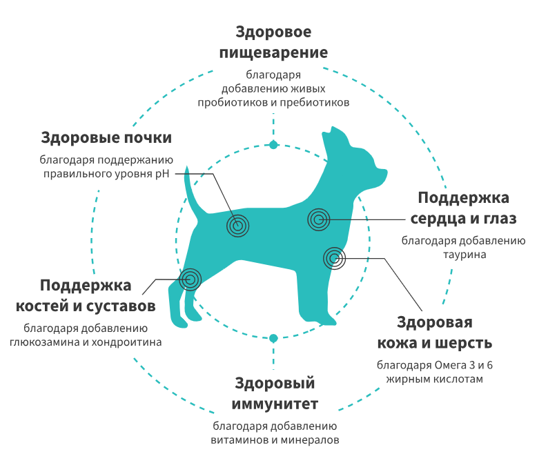 Наши корма содержат один миллиард живых и полезных пробиотиков на один килограмм корма. Пробиотики поддерживают микрофлору кишечника, помогают усвоению питательных веществ и укрепляют иммунитет. Пробиотики добавляются после производства в специальных кишечнорастворимых микрокапсулах, остаются живыми и выполняют свои функции.
