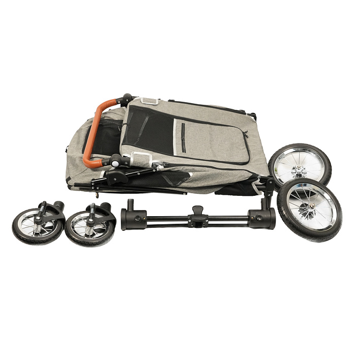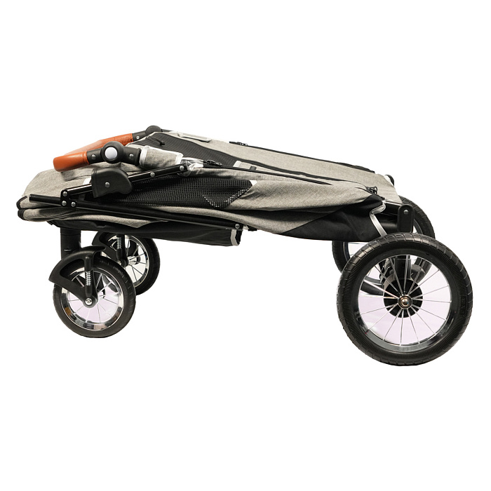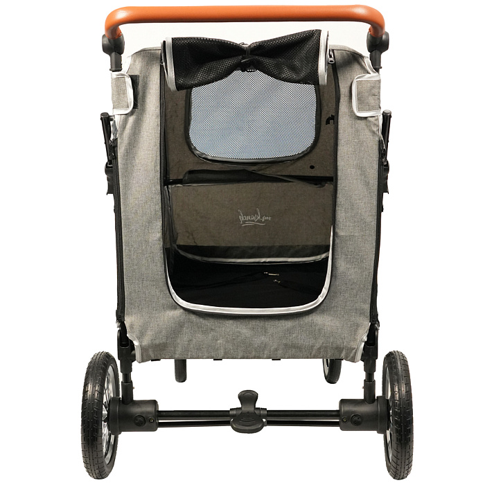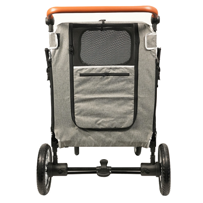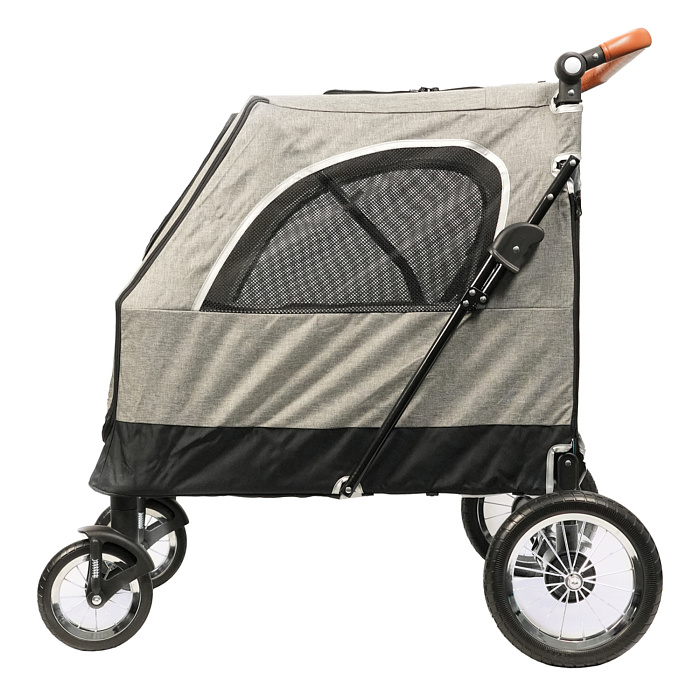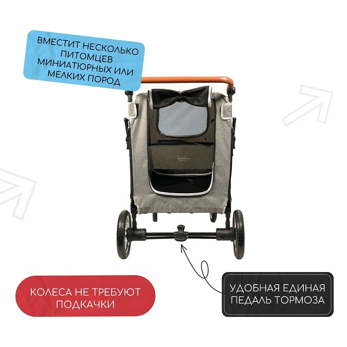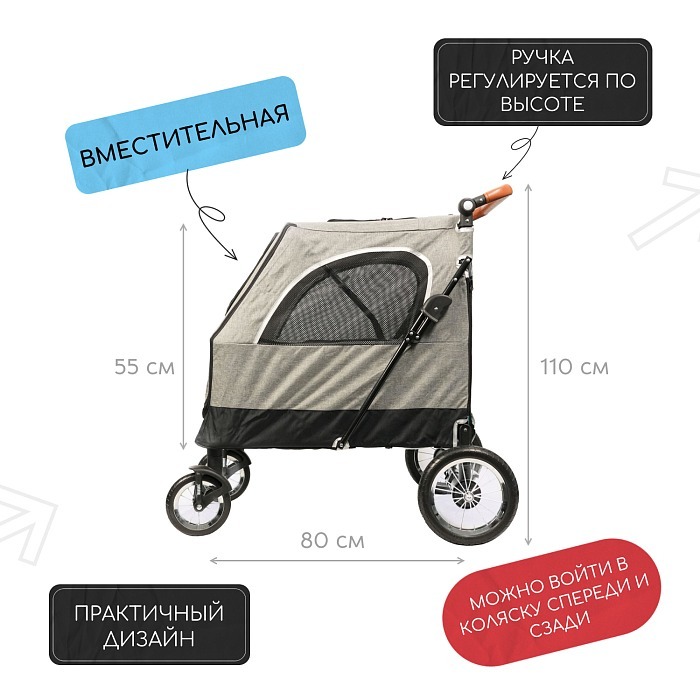 Также аксессуар незаменим для крупных и средних собак. Несмотря на габариты, коляска достаточно маневренная благодаря поворотному механизму на передних колесах. Стальная рама на устойчивом шасси удержит питомцев весом до 55 килограмм. Большие задние колеса снабжены системой торможения одним нажатием. Эргономичная ручка удобно регулируется по положению и высоте. В коляску возможно залезть и сзади, и спереди: на коляске предусмотрены просторные окошки. Внутри предусмотрен ремень безопасности для питомца. Под коляской есть плоский кармашек для хранения вещей.
