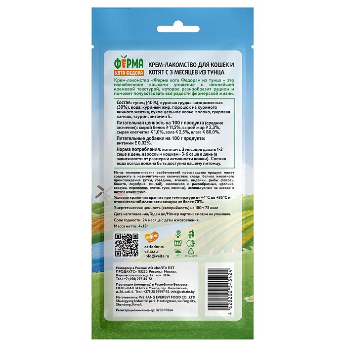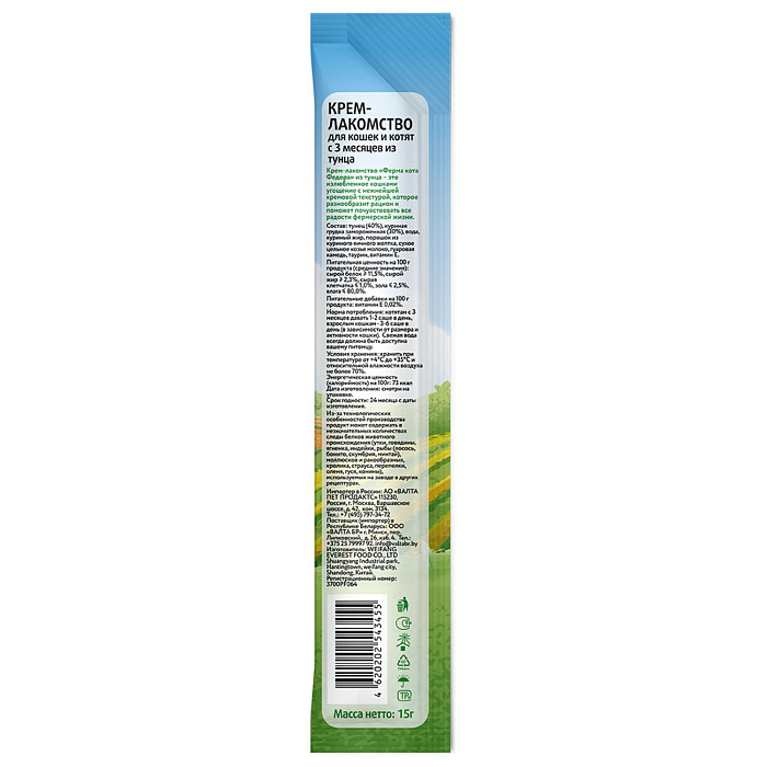 Крем-лакомство "Ферма кота Федора" из тунца - это излюбленное кошками угощение с нежнейшей кремовой текстурой, которое разнообразит рацион и поможет почувствовать все радости фермерской жизни. Подается как порционное угощение, или добавляется в виде аппетитного соуса к основному рациону для обогащения вкуса привычных блюд. Изготовлено по новейшей японской технологии и соответствует мировым стандартам качества. Упаковка включает в себя 4 порционных саше весом 15 г.