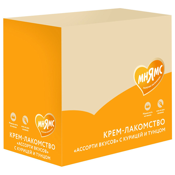 Крем-лакомство для кошек и котят с 4 месяцев "Ассорти вкусов" с курицей и тунцом. В дисплее 2 вкуса по 30 штук. Крем-лакомство "Мнямс" Ассорти вкусов с курицей и тунцом – это набор изысканных угощений с нежнейшей кремовой текстурой на основе курицы и тунца Кацуо. Идеальный баланс вкуса, полезных ингредиентов и высокого содержания влаги, так необходимого кошкам, дает возможность проявить любовь и получить благодарное лапопожатие взамен. Отлично подходит при сочетанном питании для восполнения недостатке влаги в организме. Изготовлено по новейшей японской технологии и соответствует мировым стандартам качества.