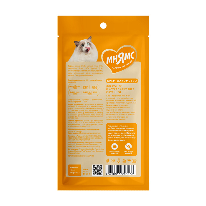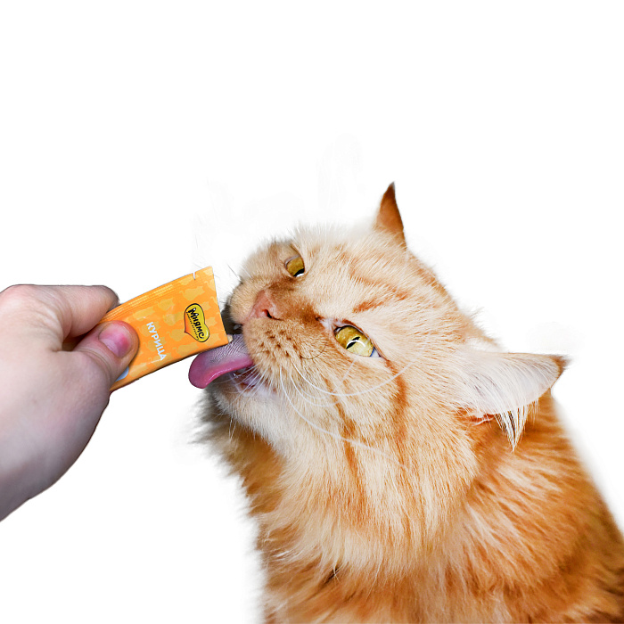 Крем-лакомство с курицей Диетическая куриная грудка Крем-лакомство «Мнямс» с курицей – это изысканное угощение с нежнейшей кремовой консистенцией. Утонченный вкус приводит кошек в восторг, а яркие эмоции довольных любимцев при кормлении с рук дарят хозяевам ощущение полного счастья. Подается как порционное угощение, или добавляется в виде аппетитного соуса к основному рациону для обогащения вкуса привычных блюд. Изготовлено по новейшей японской технологии и соответствует мировым стандартам качества.