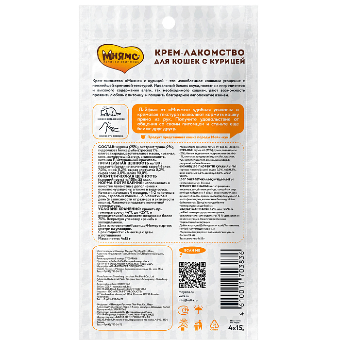 Нормы потребления: использовать в качестве лакомства в дополнение к основному рациону, а также в виде соуса. Котятам, начиная с 4 месяцев, – 1-2 пакетика в день, взрослым кошкам – 2-6 пакетиков в день (в зависимости от размера и активности кошки). Лакомство подавать комнатной температуры. Обеспечить доступ к свежей питьевой воде. Условия хранения: хранить при температуре от +4 С° до +25 С° и относительной влажности воздуха не более 75%. После вскрытия упаковки хранить в холодильнике не более суток.