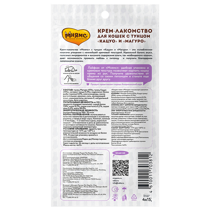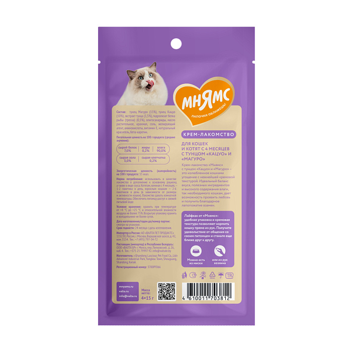 Крем-лакомство с тунцом Кацуо и Магуро Тёмно-красное мясо деликатесного малого тунца и красное стейковое мясо желтопёрого тунца Крем-лакомство «Мнямс» с тунцом – это изысканное угощение с нежнейшей кремовой консистенцией. Утонченный вкус приводит кошек в восторг, а яркие эмоции довольных любимцев при кормлении с рук дарят хозяевам ощущение полного счастья. Подается как порционное угощение, или добавляется в виде аппетитного соуса к основному рациону для обогащения вкуса привычных блюд. Изготовлено по новейшей японской технологии и соответствует мировым стандартам качества.