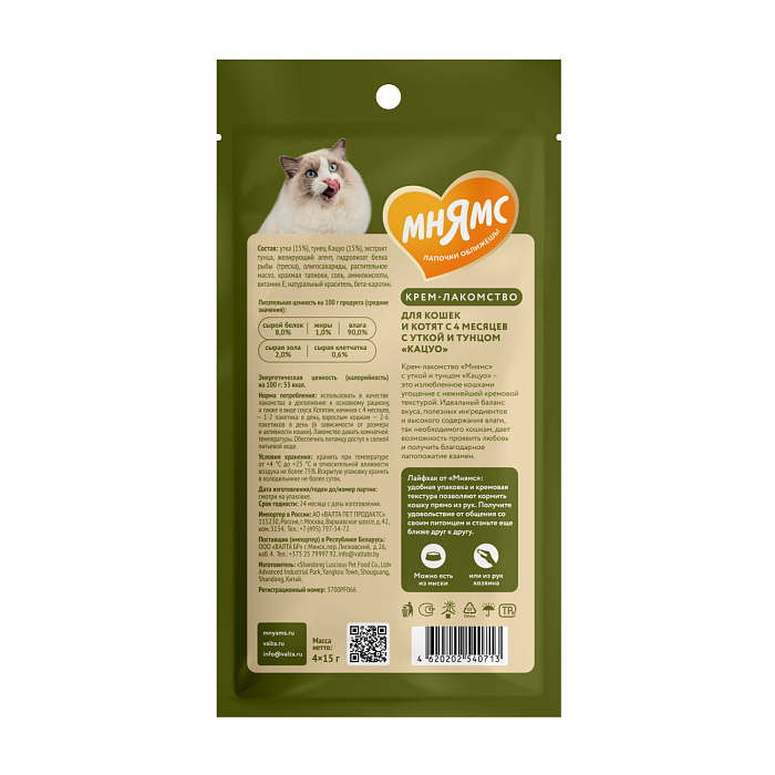 Крем-лакомство «Мнямс» с уткой и тунцом "Кацуо" – это излюбленное кошками угощение с нежнейшей кремовой текстурой.