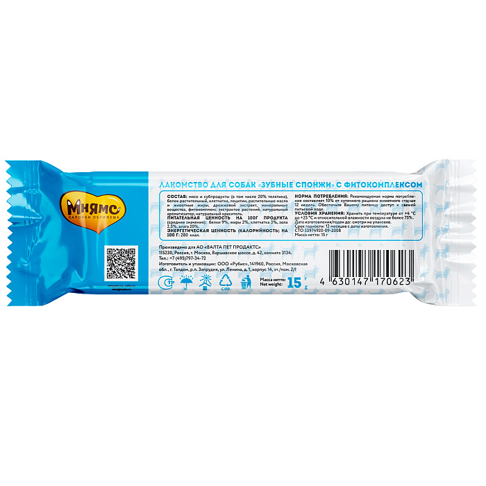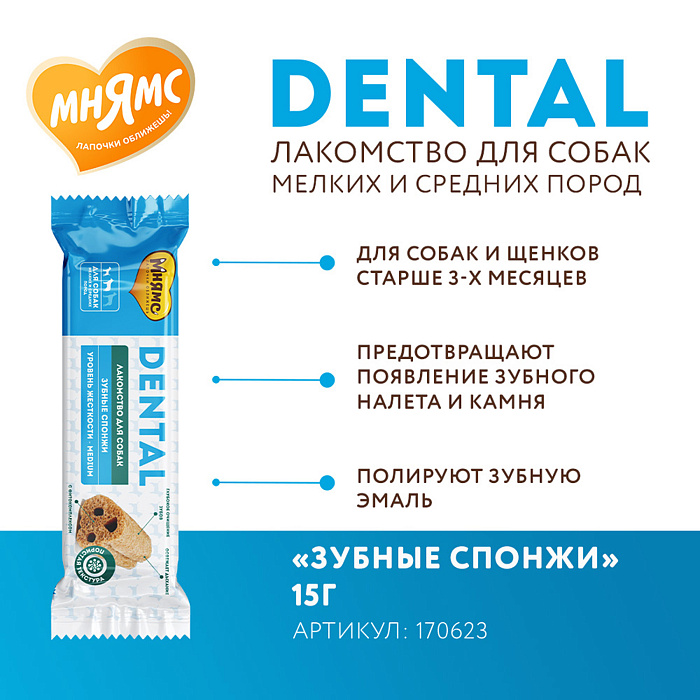 Мнямс ДЕНТАЛ "Зубные спонжи" – вкусное и полезное лакомство для взрослых собак и щенков старше 3-х месяцев. Благодаря специальной форме и структуре, спонжи позволяют эффективно и бережно очистить и отполировать зубную эмаль без применения зубной пасты, предотвращают появление зубного налета и камня, защищают от появления запаха из пасти и снижают риск развития заболеваний полости рта.