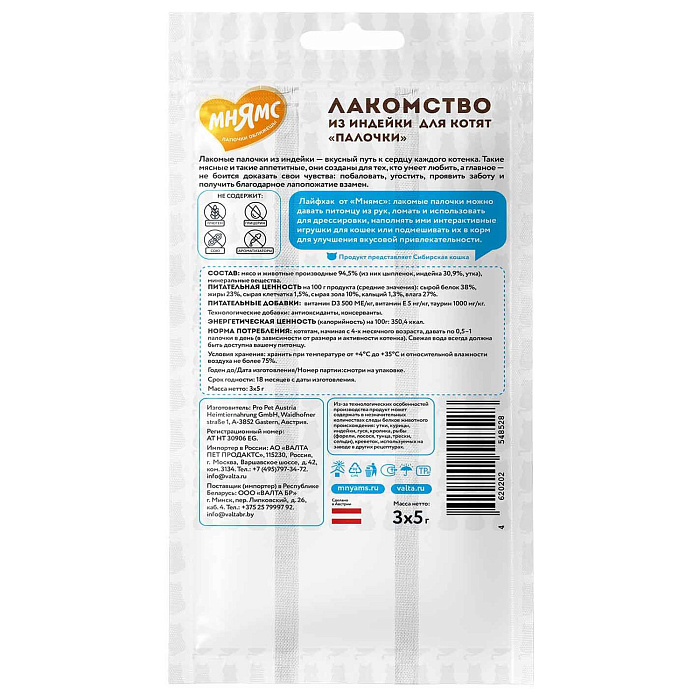 Норма потребления: котятам, начиная с 4-х месячного возраста, давать по 0,5–1 палочки в день (в зависимости от размера и активности котенка). Свежая вода всегда должна быть доступна вашему питомцу.