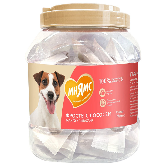 "Мнямс" Лакомство "Фросты" с лососем для собак и щенков с 4 месяцев - это сублимированные беззерновые лакомства с высоким содержанием животного белка (куриная грудка 55%, лосось 23%), созданные при помощи прогрессивной технологии сушки, которая сохраняет натуральный вкус мяса и питательные свойства ингредиентов. Манго и питахайя в составе являются источниками витаминов группы В, необходимых для укрепления иммунитета питомца. Одна упаковка "Фростов" содержит лакомства двух видов: с лососем и манго и с лососем и питахайей, которые подходят для питомцев всех пород. Для собак разного веса предусмотрены различные нормы потребления: от 1 фроста в день для собак весом <5кг до >5 фростов в день для собак весом более 25 кг. Размер М, в упаковке 24 штуки. Лакомство "Фросты" с лососем для собак и щенков с 4 месяцев очень вкусное и не оставит равнодушным даже самого привередливого любимца!