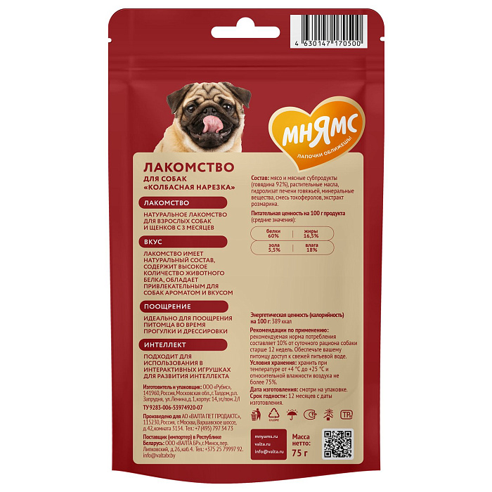 Мнямс лакомство для собак Колбасная нарезка - вкусное и полезное лакомство для собак и щенков старше 3-х месяцев с высоким содержанием белка, незаменимыми аминокислотами, витаминами и минералами. Обладают высокой вкусовой привлекательностью, благотворно влияют на нервную и сосудистую системы. Идеально подходят в качестве ежедневного угощения и поощрения во время тренировок.
