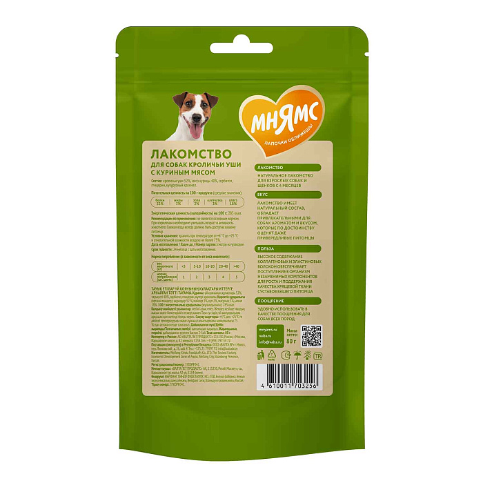 Натуральное лакомство для взрослых и растущих собак (с четырех месяцев). Кроличьи уши с куриным мясом "Мнямс" - это полезное диетическое лакомство, содержащее легкоусвояемый белок. Настоящий деликатес с вялеными ломтиками отборного филе не оставит равнодушным даже самого капризного любимца.