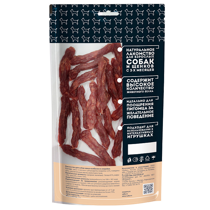 Мнямс лакомство для собак Мини-колбаски из индейки - вкусное и полезное лакомство для собак мелких и средних пород, а также щенков старше 3-х месяцев с высоким содержанием белка, незаменимыми аминокислотами, витаминами и минералами. Обладают высокой вкусовой привлекательностью, идеально подходят в качестве ежедневного угощения и поощрения во время тренировок.