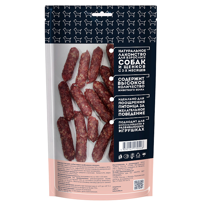 Мнямс лакомство для собак Мини-колбаски из ягненка - вкусное и полезное лакомство для собак мелких и средних пород, а также щенков старше 3-х месяцев с высоким содержанием белка, незаменимыми аминокислотами, витаминами и минералами. Обладают высокой вкусовой привлекательность, идеально подходят в качестве ежедневного угощения и поощрения во время тренировок.
