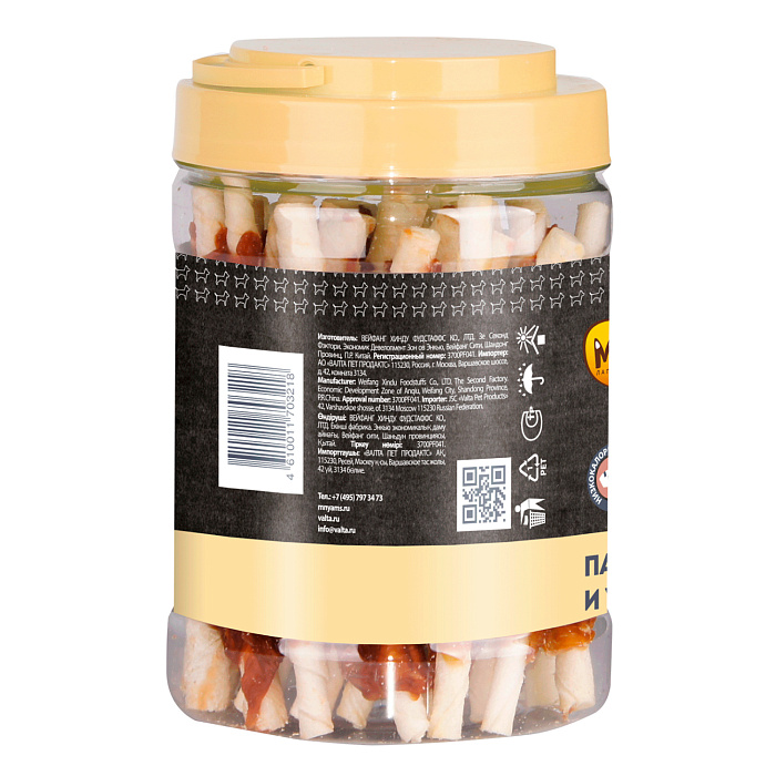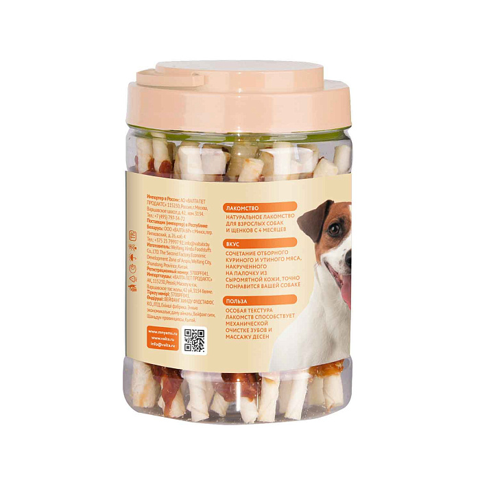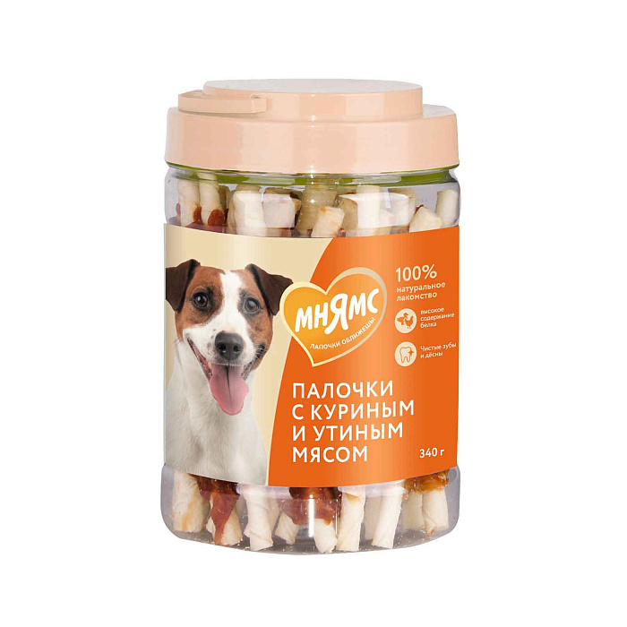 Натуральное лакомство для взрослых и растущих собак (с четырех месяцев). Палочки с куриным и утиным мясом "Мнямс" - это оригинальное жевательное лакомство, которое удовлетворяет природный жевательный инстинкт собаки. Вкусное и здоровое угощение идеально подходит в качестве поощрения для игр и тренировок.