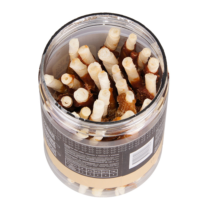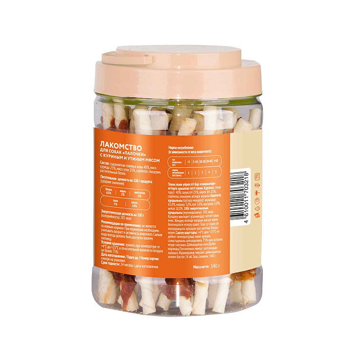 Сыромятная говяжья кожа 40%, курица 25%, утка 25%, сорбитол, глицерин, растительный белок.