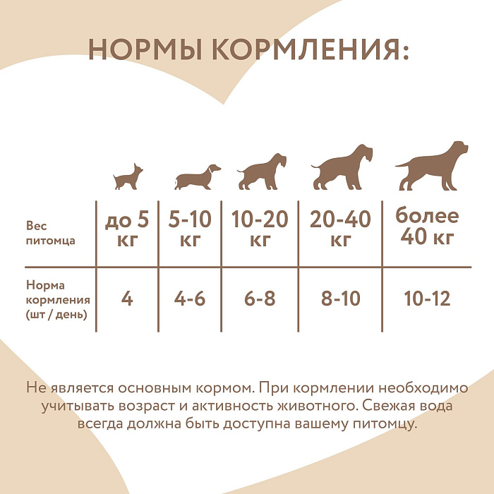 Не является основным кормом. Необходимо учитывать возраст, вес и активность животного. Подходит для щенков с 4-х месяцев. Свежая вода всегда должна быть доступна вашему питомцу. Норма потребления ( в зависимости от веса питомца): вес питомца до 5 кг - 1 шт/день, 5-10 кг - 2шт/день, 10-20 кг - 3 шт/день, 20-40 кг - 4 шт/день, более 40 кг - 5 шт/день.