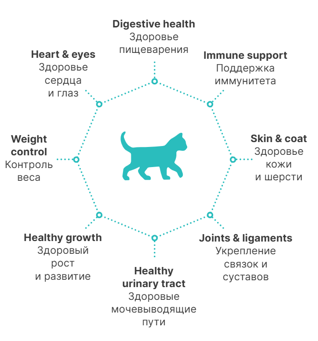 Витамины Е, С и Селен содержащиеся в составе корма выступают в роли мощной антиоксидантной системы, что способствует сохранению крепкого здоровья вашего питомца и снижает риски преждевременных возрастных изменений.