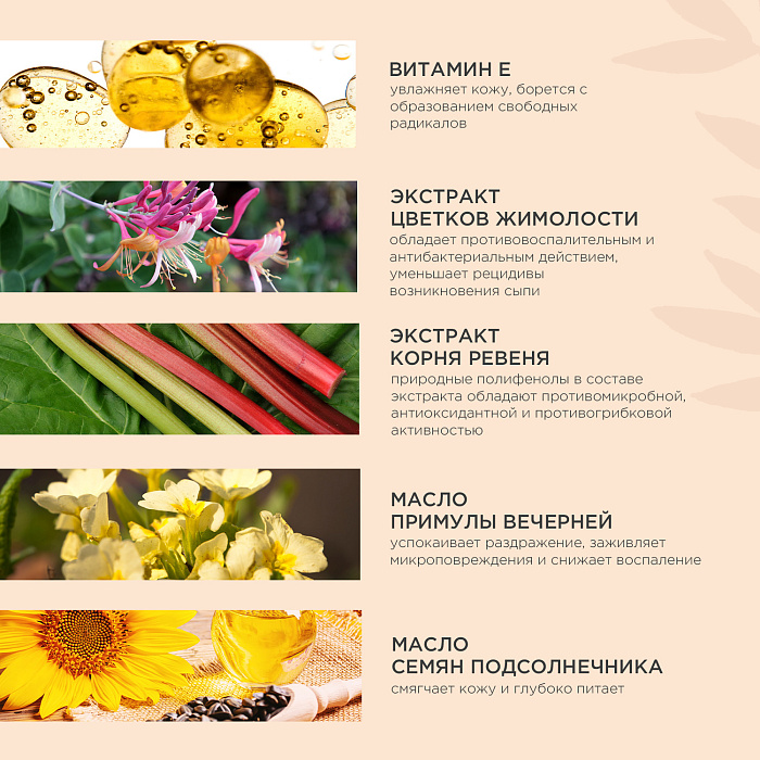 Экстракт корня ревеня пальчатого (Rheum palmatum) , экстракт цветков жимолости японской (Lonicera japonica) , масло примулы вечерней (Primula officinalis), масло семян подсолнечника (Helianthus annuus) , Церамид NP , аллантоин –, токоферол; в качестве вспомогательных: ароматизатор «Жимолость и травы», сорбитан олеат, гидроксид натрия , полиглицерил-10 пентаолеат, ксантановая камедь , пропиленгликоль, глицерин , денат спирта , Динатрий EDTA , феноксиэтанол , сорбат калия , бензилбензоат, хлорид магния, полисорбат 80, диэтилгексилсульфосукцинат натрия, вода.