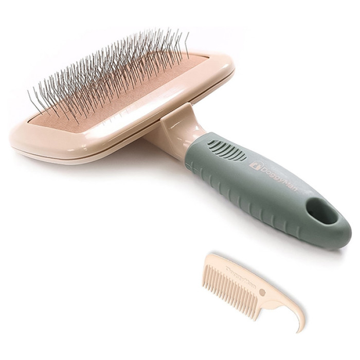 Комплект, поставляемый вместе с основной расческой, включает мини-гребень с двумя функциональными сторонами. С одной стороны, наконечник обеспечивает удобное распутывание колтунов и помогает быстро удалить шерсть, застрявшую в зубчиках сликера. С другой стороны — это идеальный инструмент для ухода за мелкими и деликатными участками, такими как челка, усики, лапы и другие чувствительные зоны. Такой двусторонний мини-гребень позволяет сделать уход максимально тщательным и качественным, обеспечивая заботу о всём теле питомца.