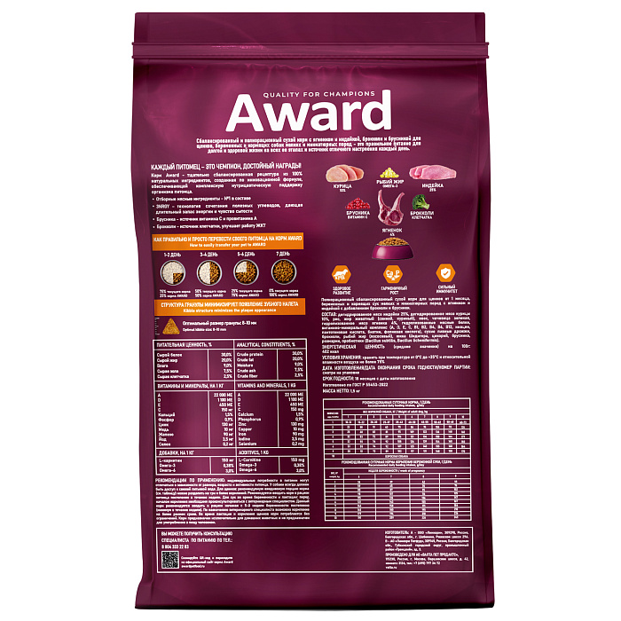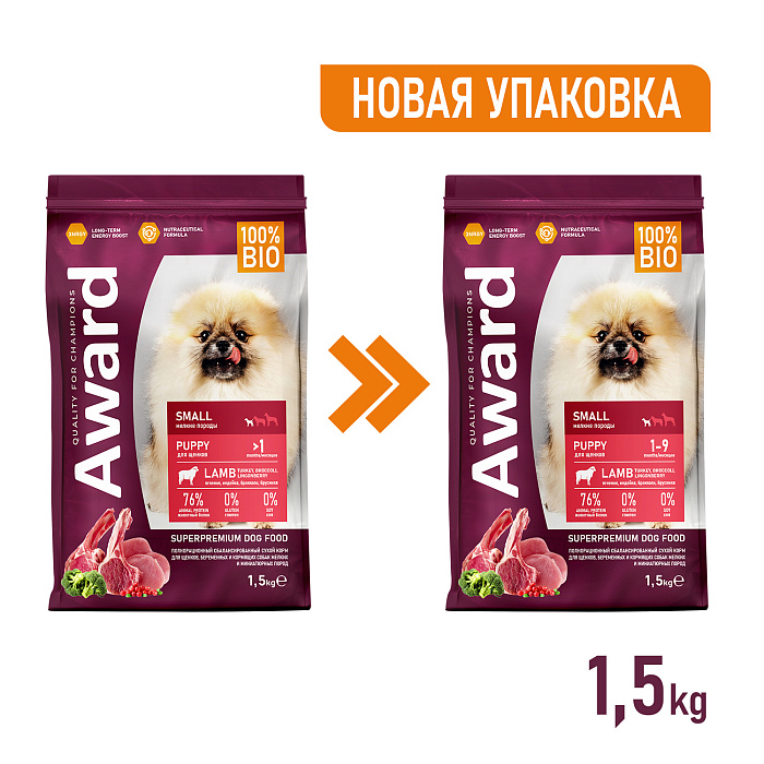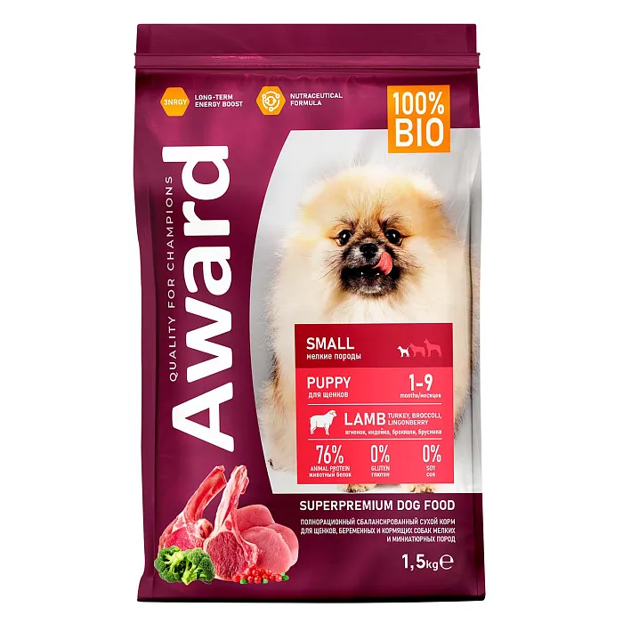 Сухой корм AWARD для щенков от 1 мес, беременных и кормящих сук мелких и мин. пород с ягненком и индейкой с добавлением брокколи и брусники 1,5кг.