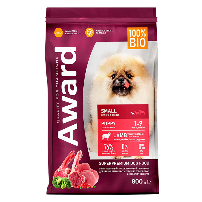 Сухой корм AWARD для щенков от 1 мес, беременных и кормящих сук мелких и мин. пород с ягненком и индейкой с добавлением брокколи и брусники 800 г.