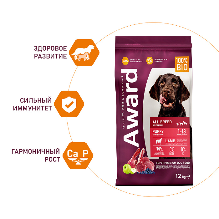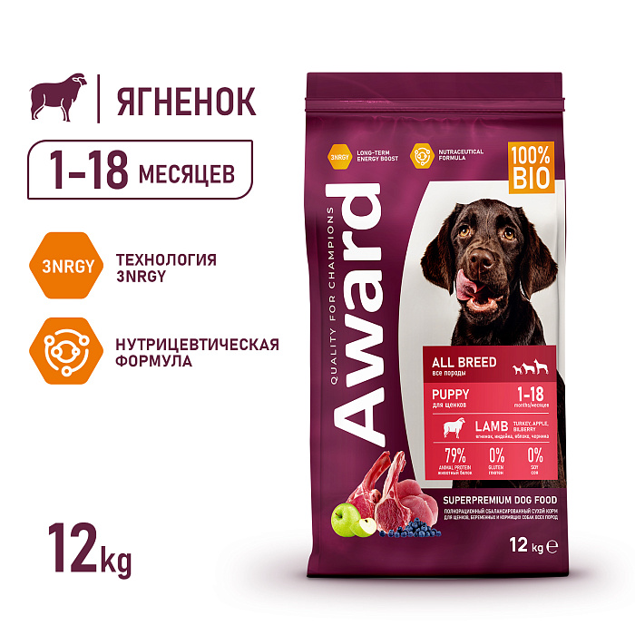 Сухой корм AWARD для щенков от 1 месяца, беременных и кормящих сук всех пород с ягненком и индейкой с добавлением яблока и черники 12 кг.